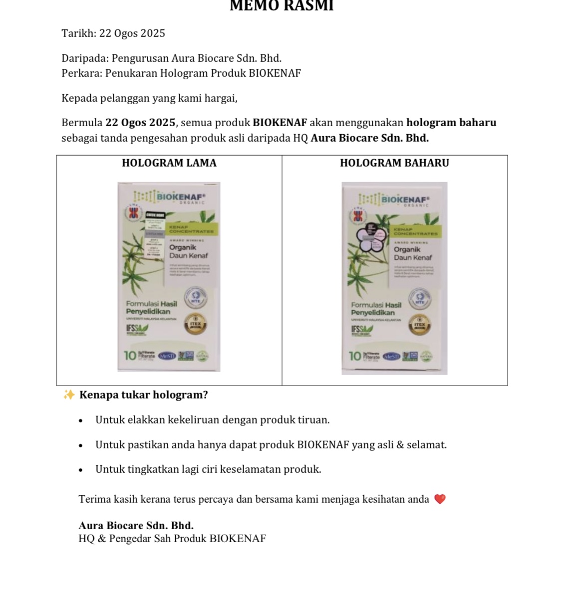 Biokenaf® mempunyai sistem hologram. Pastikan setiap kotak anda mempunyai sticker hologram.